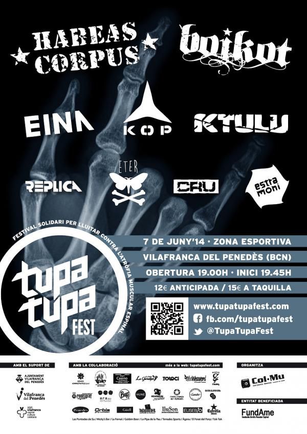 El Tupa Tupa Fest es celebrarà el proper dissabte 7 de juny a Vilafranca del Penedès i comptarà amb la presència de Boikot, Habeas Corpus, KOP, KTULU, Estramoni, CRU, Eter i Rèplica en un total de 9 hores de música.