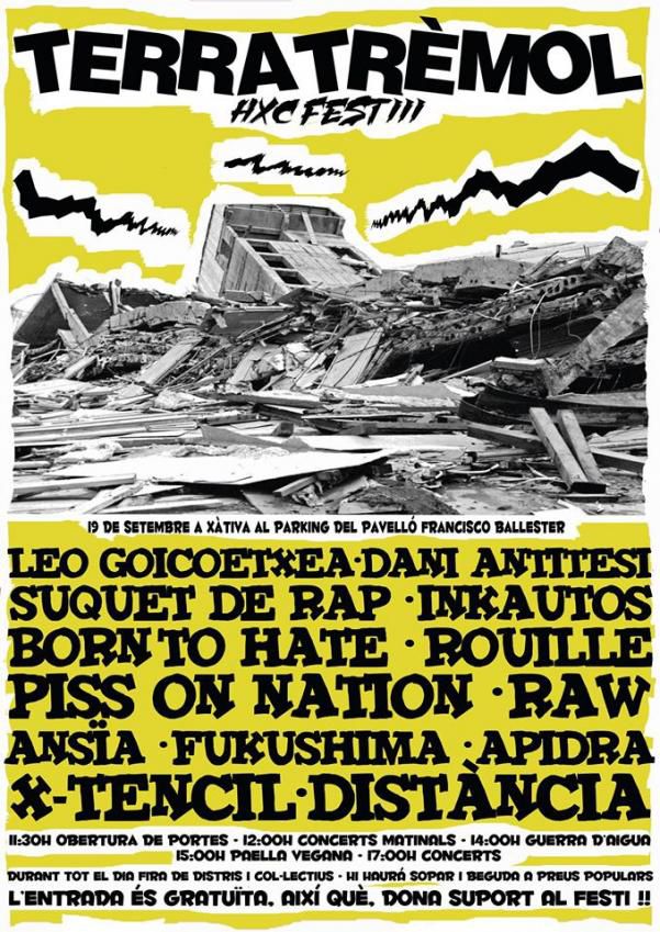 Jornada que te com a proposit difondre la filosofía del do it yourself. Començará a les 12:00 amb els concerts de Leo Goicoechea, Antitesi i suquet de rap. Despres hi haurá guerra de globus d'aigua i paella vegana per a tots els asistents. A partir de les 17:00 començaran els concerts amb 10 grups a l'escenari. desde Barcelona Born to hate i Ansïa, desde València Fukushima i Piss on nation, De Castelló vindrán Raw i Apidra, de La iruela (Jaen) Inkautos, de Sarragossa Rouille I com a bandes de Xàtiva X-Tèncil i Distància.
