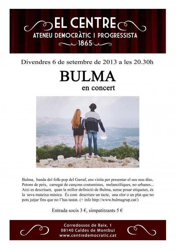 Els quatre nois del Garraf presenten el nou disc, Petons de peix, un treball que té el valor afegit d’haver-se fet realitat gràcies als seus mecenes i petits productors de Verkami, que van reunir la xifra necessària en només 8 dies. El disc està carregat de cançons costumistes, melancòliques, no urbanes... Així es descriuen, quan la millor definició de Bulma, sense posar etiquetes, és la seva mateixa música. És com descriure un tacte, una olor o un plat que no pots jutjar fins que no l’has tastat.