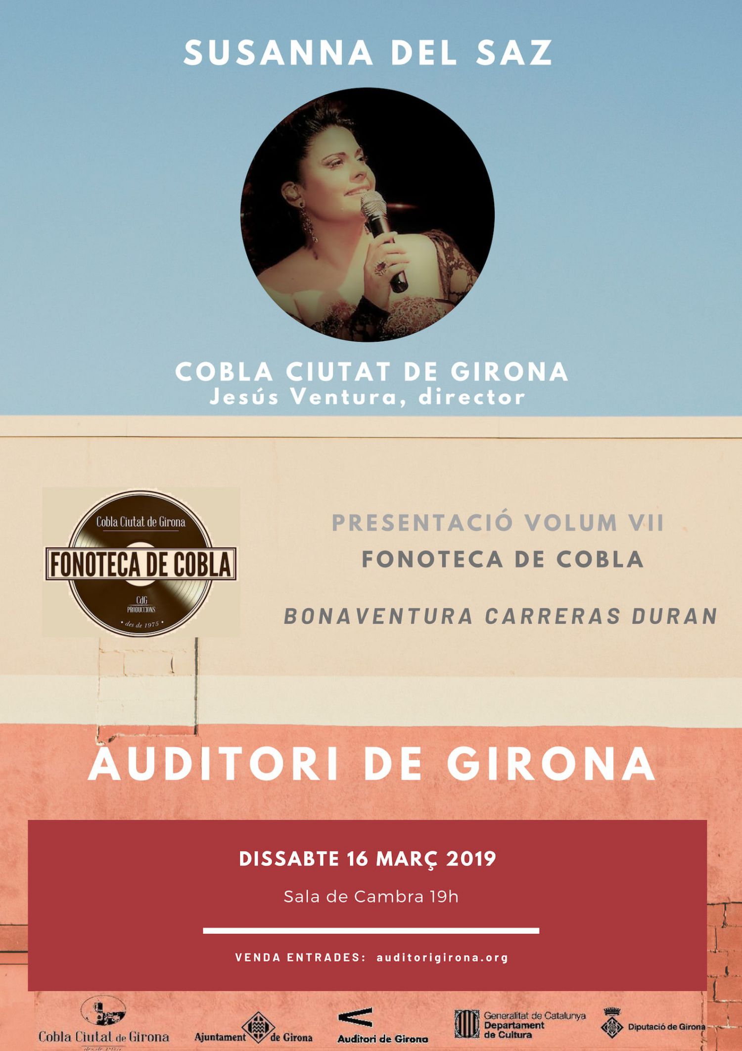 Enguany la cobla Ciutat de Girona presenta un concert amb doble proposta: d’una banda, la presentació del volum VII de la Fonoteca de cobla dedicat al compositor gironí BONAVENTURA CARRERAS DURAN (1886-1971), una petita mostra d’algunes de les seves composicions més destacades . I d’una altra banda, i en col·laboració amb la cantant SUSANA DEL SAZ, farem un viatge en el repertori vocal català entre cançons i sardanes.