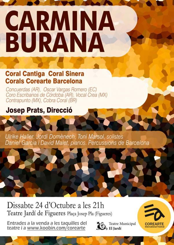 ‘Carmina Burana’ significa ‘cançons populars de Beuren’: es tracta d’un conjunt de 228 textos goliardescos (probablement del segle XIII) que inclouen poemes, breus quadres escènics, cançons, etc., escrits en llatí, tret d’alguns en alemany medieval.La versió que us proposem és la reducció per a dos pianos, percussió, solistes i cor.