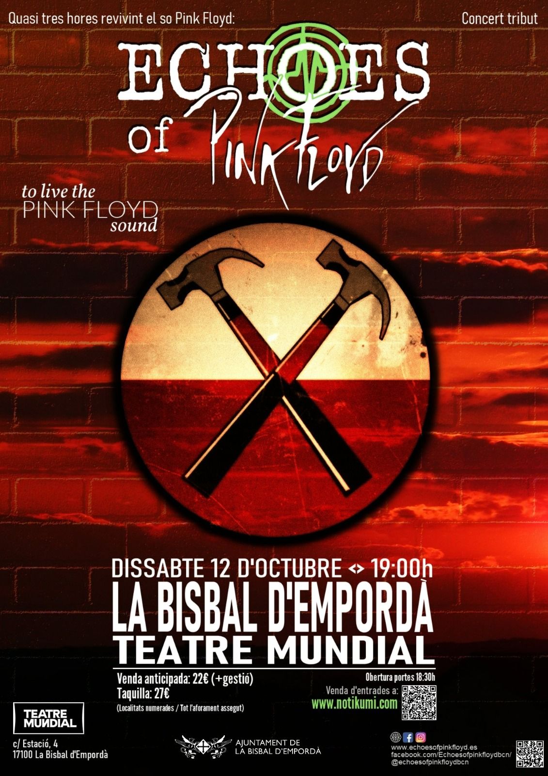 Echoes Of Pink Floyd recrea el so del quartet anglès acompanyat d'un espectacle visual de llums, projeccions i efectes de so que no deixen indiferent. Amb temes com ‘Shine On You Crazy Diamond’, ‘Wish You Were Here’, ‘Time', 'Another Brick In The Wall’ entre d'altres, Echoes busca la fidelitat del so que van fer grans a Pink Floyd en un show de gairebé tres hores.