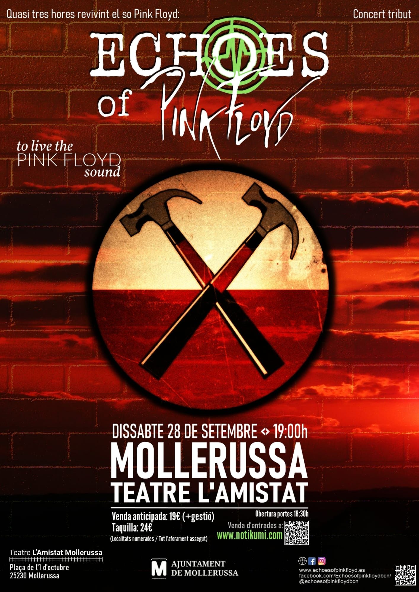 Echoes Of Pink Floyd recrea el so del quartet anglès acompanyat d'un espectacle visual de llums, projeccions i efectes de so que no deixen indiferent. Amb temes com ‘Shine On You Crazy Diamond’, ‘Wish You Were Here’, ‘Time', 'Another Brick In The Wall’ entre d'altres, Echoes busca la fidelitat del so que van fer grans a Pink Floyd en un show de gairebé tres hores.