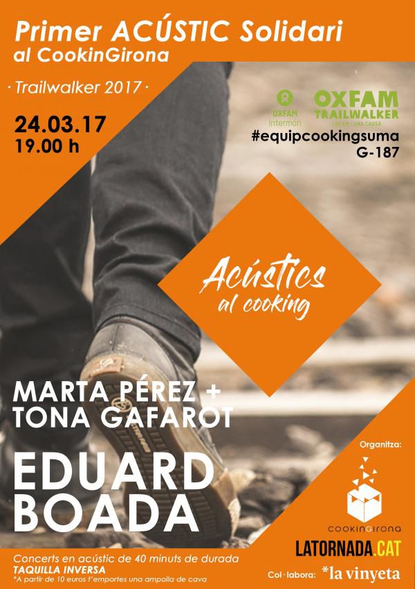 CookinGirona i La Tornada s'uneixen per donar forma als Acústics al Cooking. El dia 24 de març arribarà el primer concert d'aquesta nova iniciativa, que tindrà caràcter solidari i servirà per recaptar fons per la Trailwalker d'Intermón Oxfam. Eduard Boada i el duet format per Marta Pérez i Tona Gafarot seran els protagonistes d'un concert en què el músics compartiran les cançons amb el públic de la forma més propera possible: en acústic i sense equip de so.