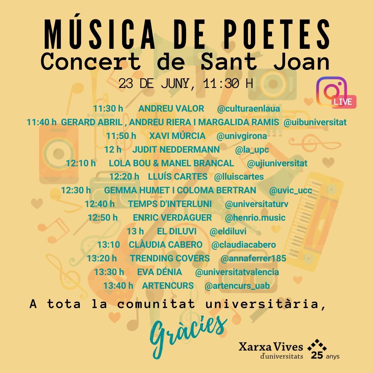 El concert de Sant Joan “Música de poetes” reunirà a cantautors catalans, valencians, balears i andorrans, que interpretaran les seues versions preferides de la poesia en català musicada. Us esperem dimarts 23 de juny, des de les 11:30 h, als directes d’Instagram.