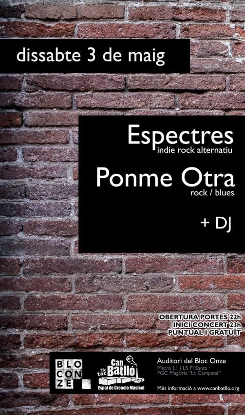 Concert d'Espectres (indie rock alternatiu) i Ponme Otra (blues i rock). Serà gratuït i començarà a les 23h al nou Auditori de Can Batlló.