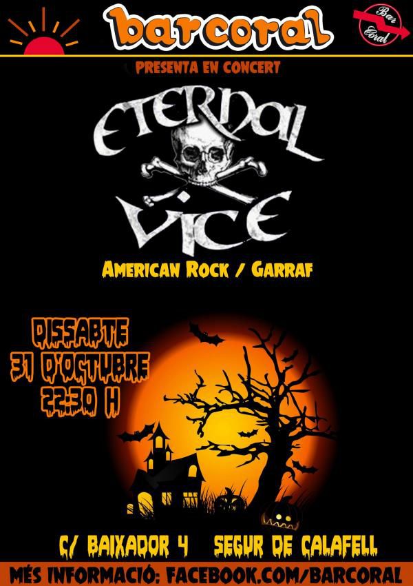 Concert del grup de Rock del Garraf Eternal Vice. Tornem al Bar Coral de Segur de Calafell on començarem menjant castanyes i desprès montarem una gran festa de Halloween a ritme de Rock