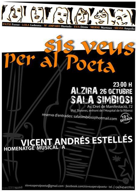 El proper dissabte 26 a les 23h a la Sala Simbiosi d'Alzira podrem disfrutar de l'homenatge musical a Vicent Andrés Estellés de la mà de Patxi Ferrer, Lola Ledesma, MªAmparo Hurtado, Eva Dénia, Merxe MartÃnez i SÃlvia Ampolla que ens presenten el projecte "Sis veus per al Poeta". L'entrada són 10€ i es pot reservar enviant un mail a [email protected] o es pot comprar a La Llibreria d'Alzira (C/Hort dels Frares), Llibreria Samaruc d'Algemesà i Llibreria La Costera de Xà tiva.