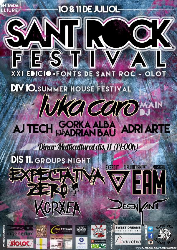 A la nit del dissabte 11 de juliol la música també en serà la protagonista, però en aquest cas els grups musicals. A partir de les 12 de la nit concerts a càrrec de Exèrcit d’Alliberament Musical (Rap i Rock), Korxea (música Rock), DesenKant (música Rock) i el grup olotí Expectativa Zero (Punk Rock, metall, trash, hardcore).