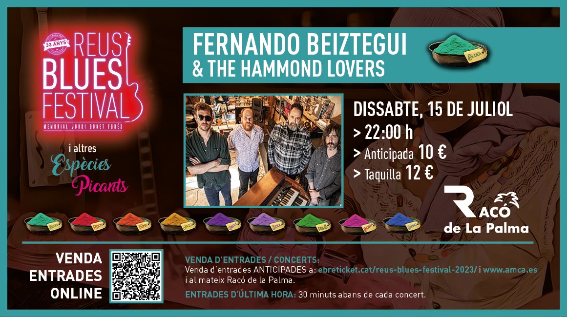 Beiztegui porta tota una vida sobre els escenaris des que comencés a fer els seus primers concerts des de la seva Granada natal, ha compartit moments i escenari amb grans músics i bandes tant nacionals com internacionals. “ Fernando Beiztegui & the Hammond Lovers” es una altra aposta forta del festival, des de Granada el “bluesman” més reconegut d’Andalusia portarà el seu feeling, la seva virtuositat a la guitarra juntament amb una veu excepcional al racó on a més vindrà acompanyat amb la banda “ The hammond lovers” on presentaran el seu darrer disc "GET IT LOUD". Tot una joia a l’abast de tothom. Les entrades es poden adquirir, anticipades amb descompte a: https://ebreticket.cat/reus-blues-festival-2023/ ó 30 minuts abans del concert, sempre que hi hagin disponibles.