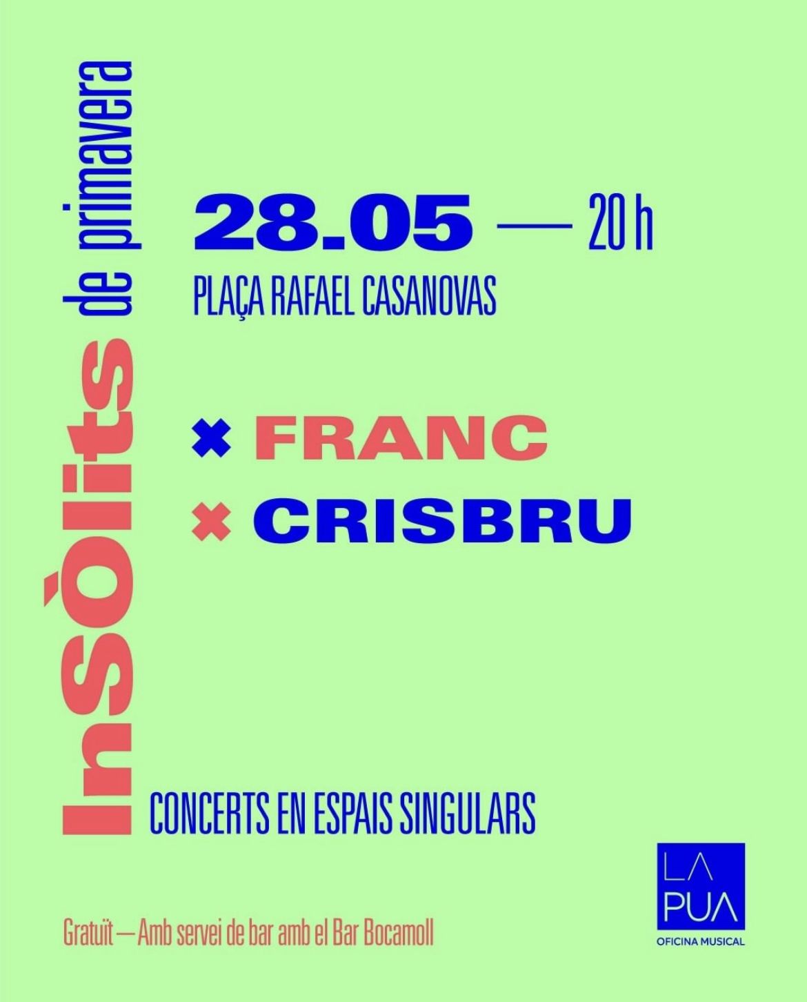 FRANC (Indiepop) obrirà el concert a les 20h i la següent en actuar serà CrisBru. Hi haurà barra del Bar Bocamoll. Us esperem!!