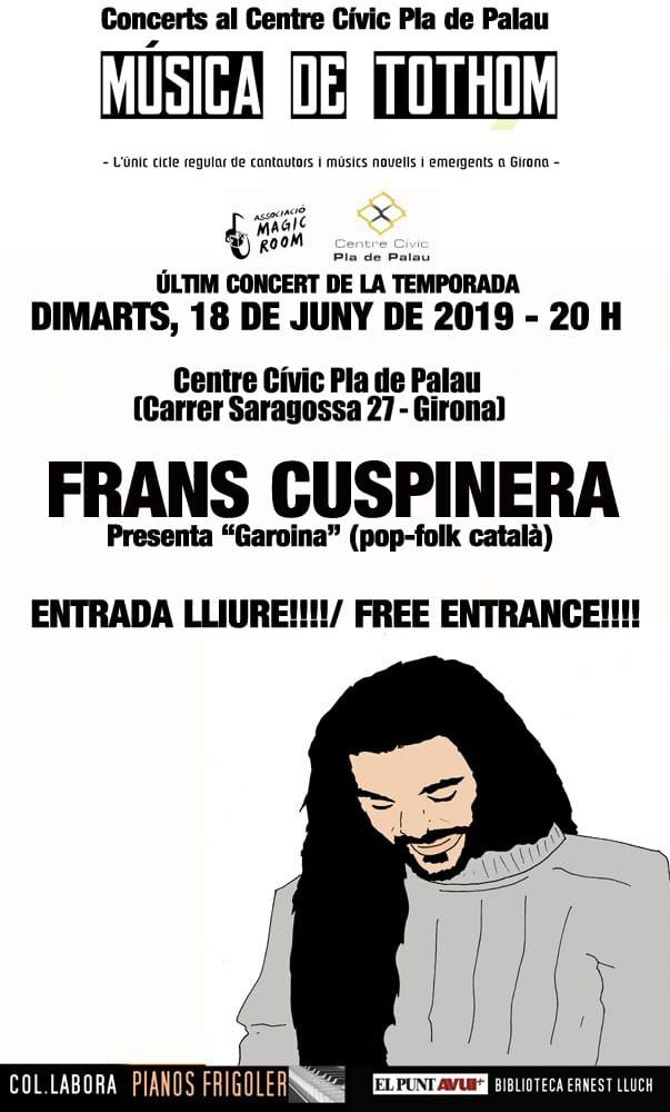Acompanyat per la pianista María Poyatos, Frans Cuspinera interpreta les cançons del seu primer disc 'Garoina' (Picap), tancant el Cicle de Cantautors organitzat per l'Associació MAGIC ROOM, al Centre Cívic Pla De Palau (Girona). Un dels últims concerts d'una gira íntima i emocional en format duet que ha superat els 60 concerts a Catalunya i que ha visitat ciutats com Màlaga, Almería, Vigo, Madrid, València, Mallorca, Saragossa, Andorra...