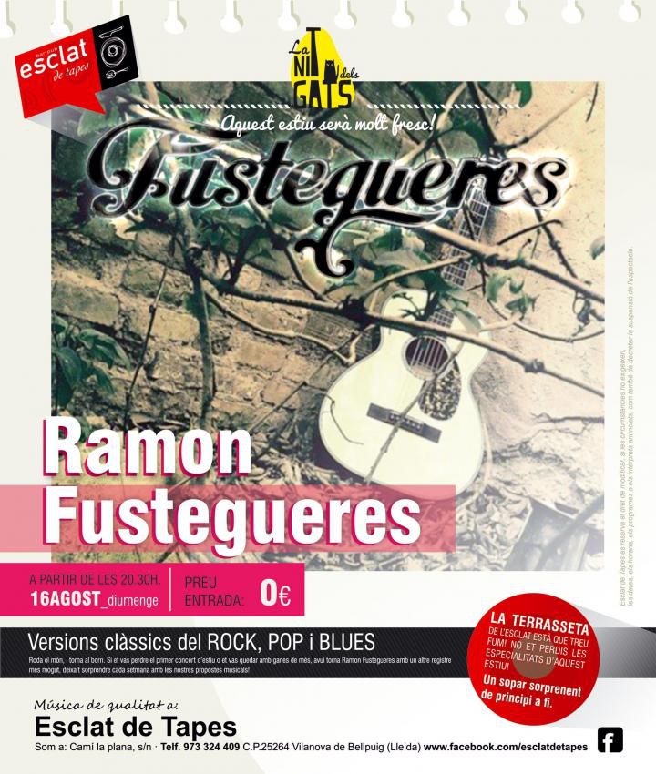 Aquest diumenge, 16 d'agost, ens visita, novament, un dels referents de les nostres terres. Des del seu poble d'adopció, Ivars d'Urgell, ens arriba Ramon Fustegueres amb les seves lletres peculiars i versions de pop, rock, blues i altres gèneres. Recorda diumenge 16 d'agost a partir de les 20.30 hores, música d'autor amb FUSTEGUERES a l'Esclat de Tapes, on la música de qualitat i el bon menjar es fusionen!!!!!