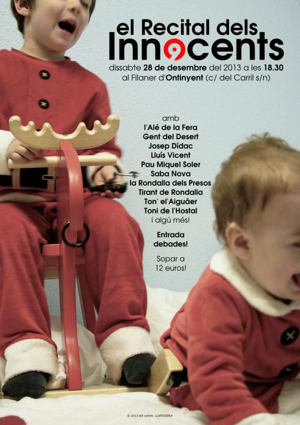 El 9é Recital dels Innocents, un cau d'artistes que s'ha celebrat de manera ininterrompuda des del 2005 a l'Alcúdia (Ribera del Xúquer) canvia enguany de comarca per causes de força major: l'espai cultural El Filaner d'Ontinyent (Vall d'Albaida), unbicat a una antiga fàbrica a la vora del riu Clariano, obrirà les portes a partir de dos quarts per a les set de la vesprada a tot lo món que vulga fruir debades de l'art escènic dels millors artistes de la rotglada; en acabant, hi haurà sopar de germanor entre intèrprets i audiència al preu de dotze euros (12€) per cap, si llavors ja teniu fam.