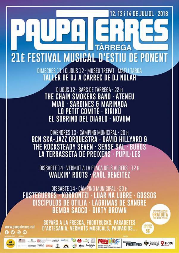 12, 13 i 14 de juliol 2018: Festival Paupaterres #Tàrrega amb BUHOS, LUAR NA LUBRE, LÁGRIMAS DE SANGRE, GOSSOS, LA TERRASSETA DE PREIXENS, PUPIL·LES... i fins a 20 formacions musicals. GRATIS FINS A LES 22:30h! A més de sopars a la fresca, food trucks i mercat de paradistes.