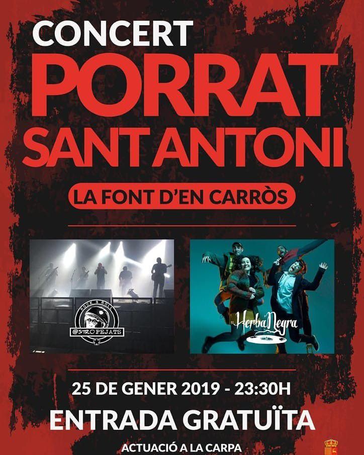 Actuació a la carpa situada al carrer Constitució dels grups "Astropejats" i a continuació del grup de rap "Herba Negra", dins la programació del Porrat de Sant Antoni 2019. Més informació al Facebook de l'Ajuntament de La Font d'en Carròs o al Facebook de la Comissió de Festes "Cabuts per la festa".