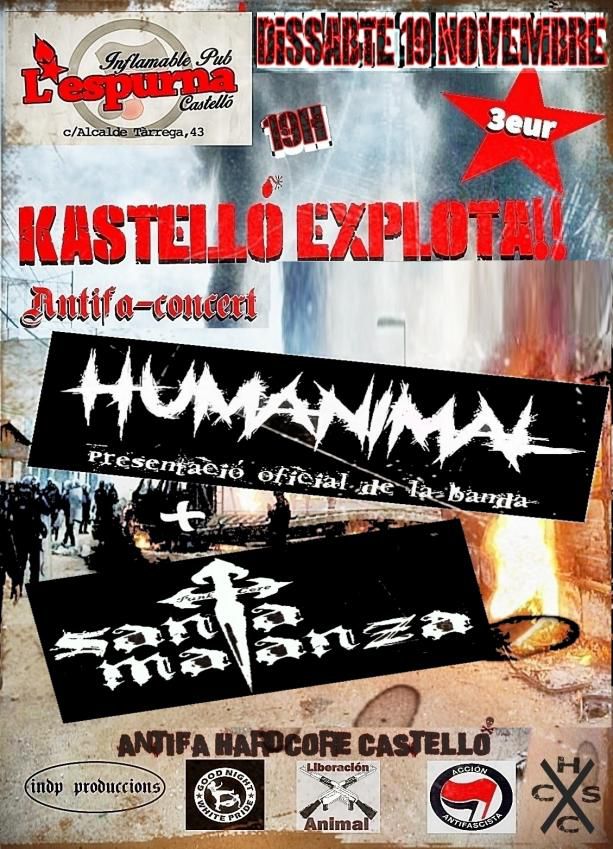 Be pues ja tenim el primer KASTELLÓ EXPLOTA!! de la temporada . será el dissabte 19 de Novembre, a les 19h, a L'espurna Inflamable Pub de Castelló, estaran HUMANIMAL (presentació oficial de la banda) + SANTA MATANZA, (Punk HXC desde Onda), en breu farem e l'event.!! Sempre recoltzan les bandes de la Terra!!!