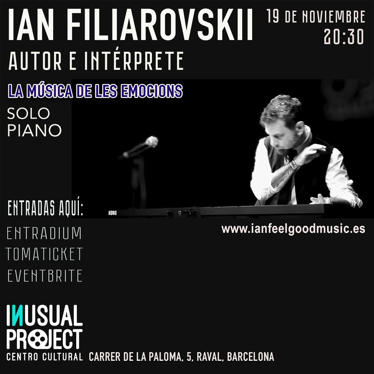 Ian Filiarovskii es un autor e intérprete que compone música en varios géneros, como neoclásico, música electrónica, hard, art y rock sinfónico, y música sinfónica. Pasa una hora de tu tiempo en el acogedor INUSUAL PROJECT CENTRO CULTURAL. Una hora llena de emociones, con música neoclásica que te transportará a otro mundo. ¡Ven y disfruta de la magia de la música en vivo! ¡El número de plazas es limitado!