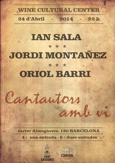 Tres cantautors, en Ian Sala, en Jordi Montañez i l'Oriol Barri, seran els encarregats d'omplir l'escenari del Wine Culture Center, a Poble Nou, amb les seves notes i composicions pròpies. Serà el dia següent de Sant Jordi, dia expressament escollit pels cantautors, així el noi i la noia tindran la possibilitat d'acompanyar la rosa o el llibre amb una original proposta, una entrada per a Cantautors amb Vi. Així ho demostren amb els preus de les entrades: Una pel preu de 4 euros i dues a 6 euros. Hora i mitja de música variada de cantautors acompanyats del millor vi, assessorats per als professionals del Wine Culture Center.