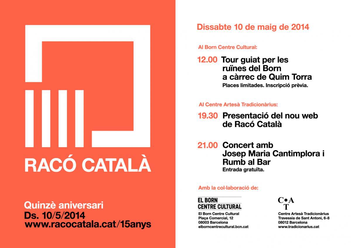 Dissabte 10 de maig, a les 12 del matí, Quim Torra ens oferirà una ruta guiada per les ruïnes del Born CC, les places són limitades i per assistir-hi es requereix d?una inscripció prèvia al web. A la tarda, a 2/4 de 7, presentarem el nou Racó Català i a les 9 farem el tradicional concert d'aniversari. Enguany comptarem amb la música de Josep Maria Cantimplora i Rumb al Bar.