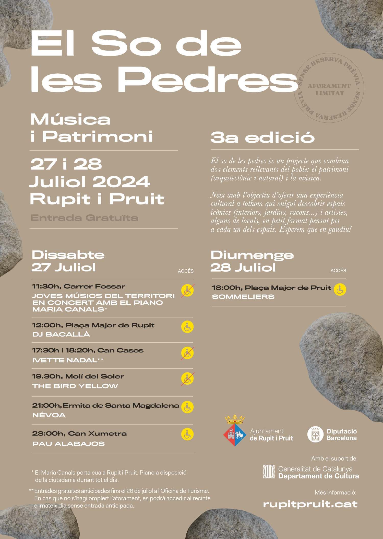 Rupit i Pruit acollirà els dies 27 i 28 de juliol, la tercera edició de ‘El So de les Pedres’. Un projecte que combina dos elements rellevants del poble: el patrimoni, arquitectònic i natural, i la música. Va néixer fa tres anys amb l’objectiu d’oferir una experiència cultural a tothom qui vulgui descobrir espais icònics. Les actuacions es fan en llocs singulars com interiors, jardins o racons del poble. Les actuacions, en petit format, estan pensades per a cada un dels espais. Enguany els espais escollits són; el carrer Fossar, la Plaça Major, Can Cases, el Molí del Soler, l'Ermita de Santa Magdalena i Can Xumetra, a Rupit, i la Plaça Major de Pruit.