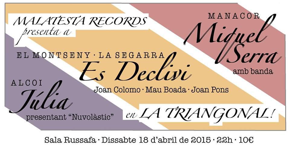 A Malatesta Records estem d'enhorabona. El 23 de març editem la nostra darrera referència, el Nuvolàstic de Júlia, referència que fa la número 20. VINT. En sis anys. No està gens malament. Com que estem contents volem celebrar-ho amb tots vosaltres i hem organitzat La Triangonal, que ajuntarà tres bandes de tres racons diferents de la mediterrània. Posant tres accents diferents a les noves -o potser no tan noves- maneres que tenim de fer rock cantat en el nostre idioma.