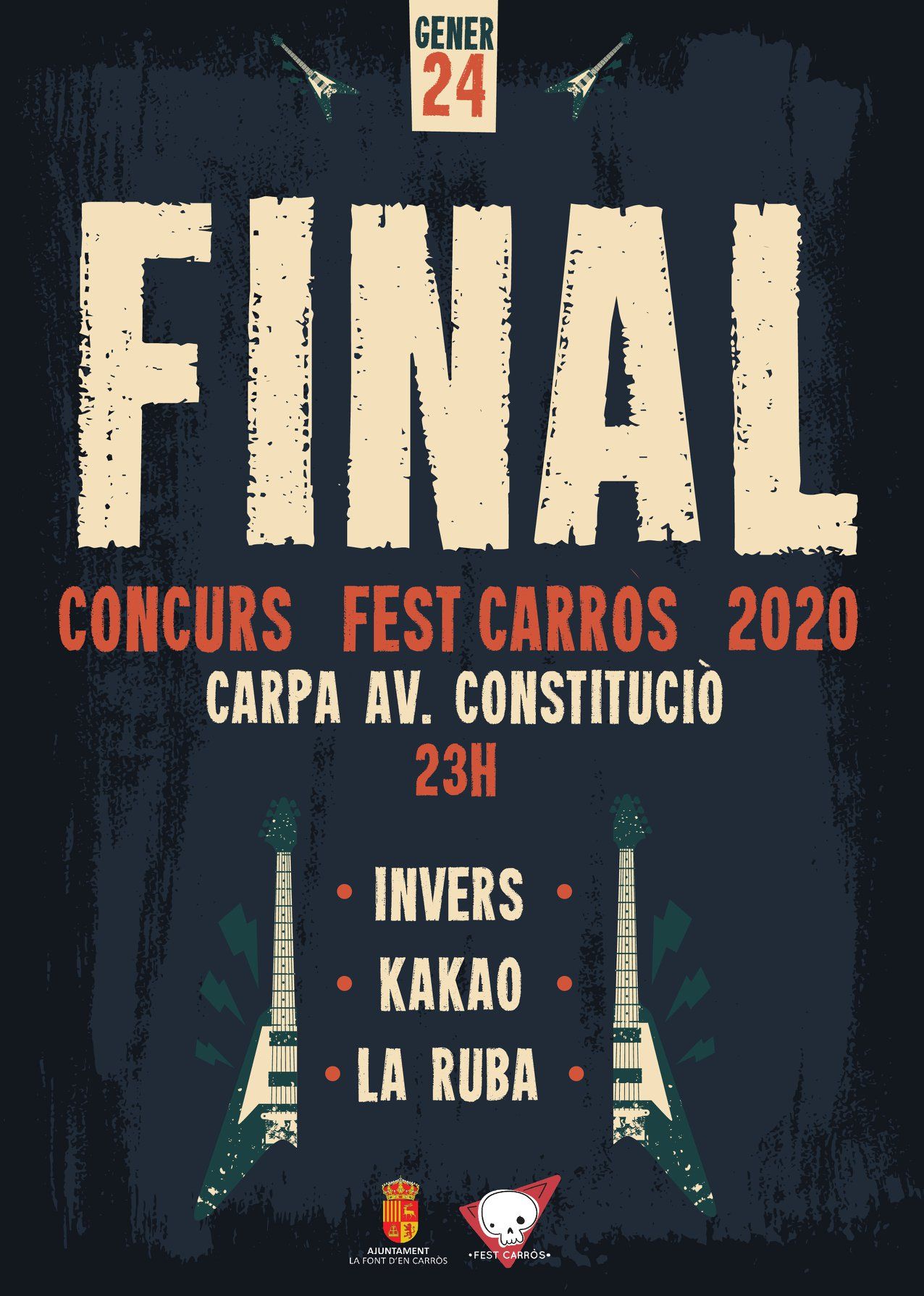 Tenim el plaer de presentar el cartell de la Final del Concurs del Festcarròs 2020, se celebrarà el proper divendres 24 de gener a partir de les 23h en la carpa de l'Avinguda Constitució.