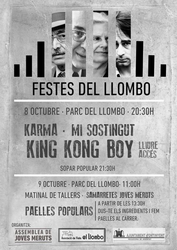 L'Assemblea de Jóvens Meruts s'han comboiat amb l'associació veïnal del barri del Llombo d'Ontinyent per a muntar un concertet de festes amb tres grups com tres sols: Karma, King Kong Boy i Mi Sostingut, a vore quin de tots més guapet.
