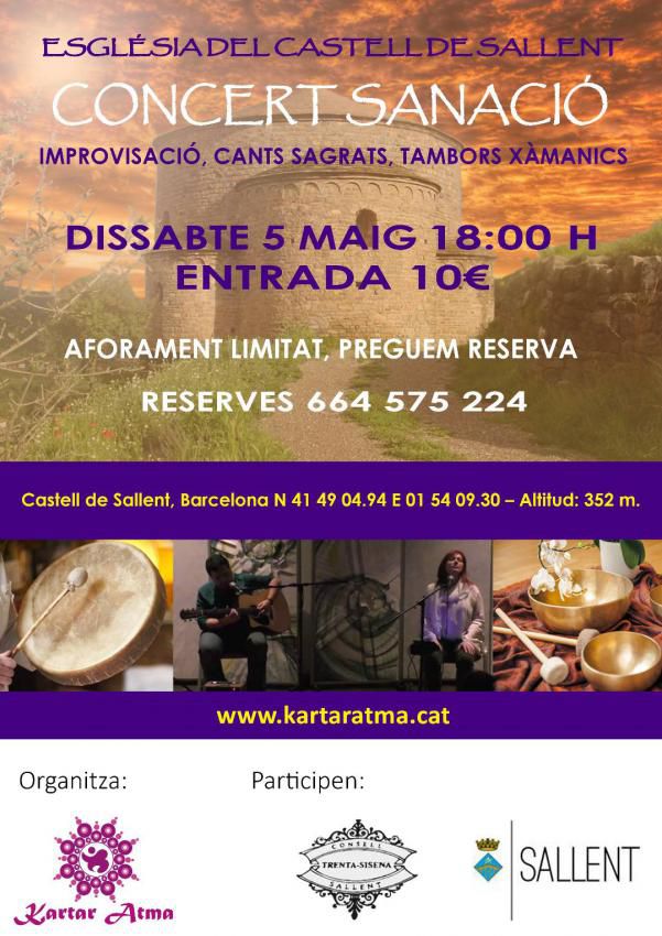 Dissabte 5 de Maig a les 18?h concert de Kartar Atma a l'església del Castell de Sallent, un concert de música d'alta vibració energètica amb cant de mantres i improvisació en un lloc ple d'història. L’església de Sant Sebastià i Sant Esteve és l'església romànica de planta circular més gran de Catalunya i forma part del Patrimoni Artístic Nacional de Catalunya.