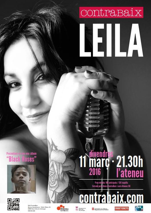 El cicle ContraBaix presenta un dels màxims exponents del nou soul barceloní més elegant i atractiu: Leila. El divendres 11 de març a les 21:30h, Leila ens presentarà a l’Ateneu Santfeliuenc el seu nou disc, “Black Roses”, en el que barreja els estils Neosoul, R&B, Hip Hop, Funk, Jazz, Blues i Gospel creant un so fresc on predomina l’harmonia vocal.