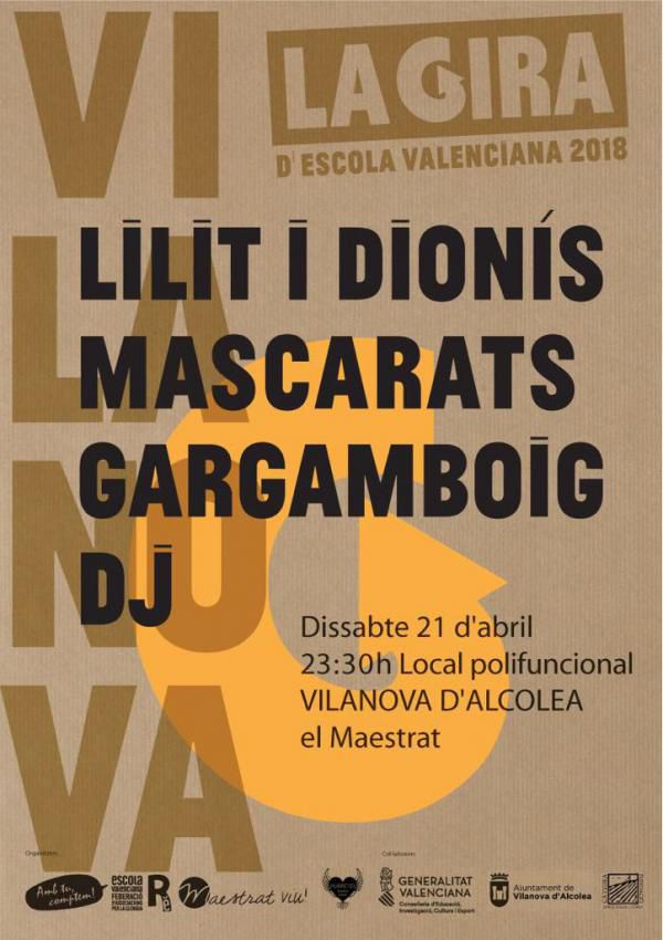 La Gira farà acte de presència al Maestrat, amb l'actuació de Mascarats, Lilit i Dionís i Gargamboig. Mascarats representa la unió del Montsià i el Maestrat, amb una música i un directe potent i desacomplexadament reivindicatiu iniciaran els concerts. Lilit i Dionís continua amb el seu idil·li vilanoví, on reviurem amb els seus temes desenfadats els Vilalternativa que els primers joves de Vilanova van organitzar amb tanta bona acollida. Gargamboig, amb el seu agropunk de la Plana, rematarà la nit apujant els decibelis del local polifuncional.
