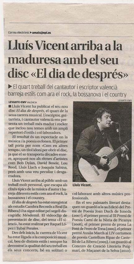 "La cicatriu és testimoni de memòria, d’una memòria confusa i d’oblit plena.Si furguem en el seu laberint de records encara podem trobar la ferida a dessota, els crepuscles dels rostres, un vianant a un carrer fosc i isolat, un país humiliat per defensors de la brutalitat, una tinta bruta cristal•litzada per sempre més, unes estàtues inerts en el temible pas del temps...Però també trobarem pell viva sagnant present, sí, també trobarem flors viscerals i tendres,vivències i goig etern, llavis de paper, llengües entrellaçades com un vers,i boques airades reclamant el jorn i el treballat jornal, la família refeta, un home rehabilitat, llibertat i rebel•lia, amor a mans plenes, i sí, la vida! Trobarem la plenitud de la vida que conté cadascú de nosaltres! Per això aquest disc on les cançons formen part d’una cicatriu passada i sobreviscuda, vull agraïr- ho a Helena Caravaca Sánchez i a Vicent Sengermés i Blasco. Molt especialment als amics i coneguts que han ajudat econòmicament a l’eixida d’aquest disc. Aquestos són: Feliu Sempere Nàcher (al, qual li agraïsc el gran treball del disseny gràfic del disc també), Marta Izquierdo Sanchis, Óscar Mira Pérez, Dani Caparrós, Artur Gallego Lainez, i a JoanLluis Llopis Salvador. Per últim agraïr a Mesdemil l’edició del disc, a Tubal Perales i a Raquel López per la realització i producció del videoclip i a eixa gent especial que m'acompanya, anomenada públic. Es tracta d'eixa gent que fuma i aguanta, o no fuma i millor, viu la vida sense amargar-se, recordant que sols existeix el present, que treballa tot i que no siga remuneradament però honestament, amb ètica pel treball per ells i elles i pels altres, i que aprecia que les millors coses de la vida no costen diners, que gaudeixen de l'olor de la muntanya després de ploure, que aprofiten tot el que miren els seus ulls de bondat i justícia, ànimes generoses , no envejoses ni rancunioses, en fi, la gent del meu poble, que s'entrega a la vida i al País. Moltes gràcies!!!"
