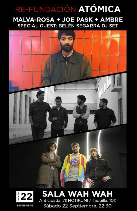 Tras unas merecidas vacaciones de verano el 22 de septiembre inauguramos temporada con un cartel delicatessen. Ambre, Joe Pask y Malva-Rosa protagonizarán la primera de las noches atómicas de la temporada 2018 - 2019 en la renovada sala Wah Wah. Tres bandas que son el presente de la escena independiente y todas ellas presentan nuevo trabajo este año. Además en el caso de Ambre será su primera fecha en València.