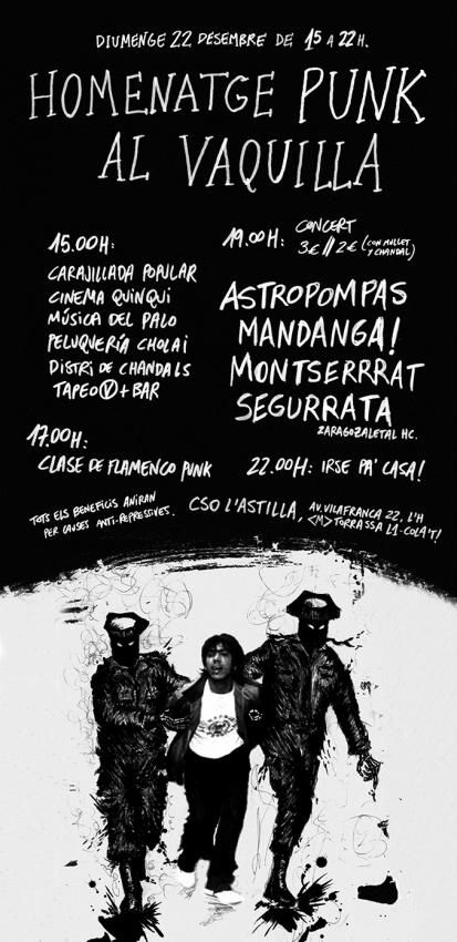 Amb motiu dels 10 anys de la desaparició de Juan José Moreno Cuenca, conegut popularment com "El Vaquilla", el proper Diumenge 22 de Desembre organitzarem un homenatge punk a la cultura quinqui, als barris marginals i a tota una generació de delinqüents sense més llei que la pròpia.