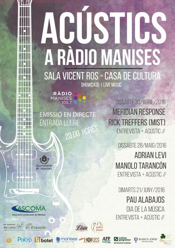 La Ràdio de Manises et convida a "Els Acústics" en direcet. Serà un format d'entrevista-acústic on podras conèixer millor a l'artista. També podras escoltar-ho per la 105.7 F.M. i en www.radiomanises.es. Els concerts continuaran el 28 de maig i el 21 de juny