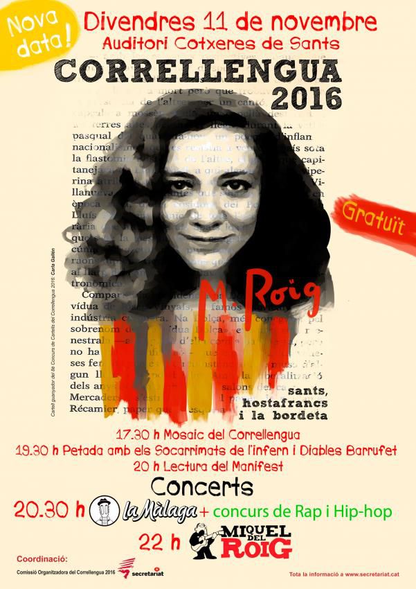 Malgrat aquest contratemps, el proper divendres 11 de novembre l'Auditori de les Cotxeres de Sants acollirà el Mosaic del Correllengua, la petada amb els Socarrimats de l'infern i Diables Barrufet, la lectura del manifest, el concurs de rap i els concerts de la Màlaga i Miquel del Roig.