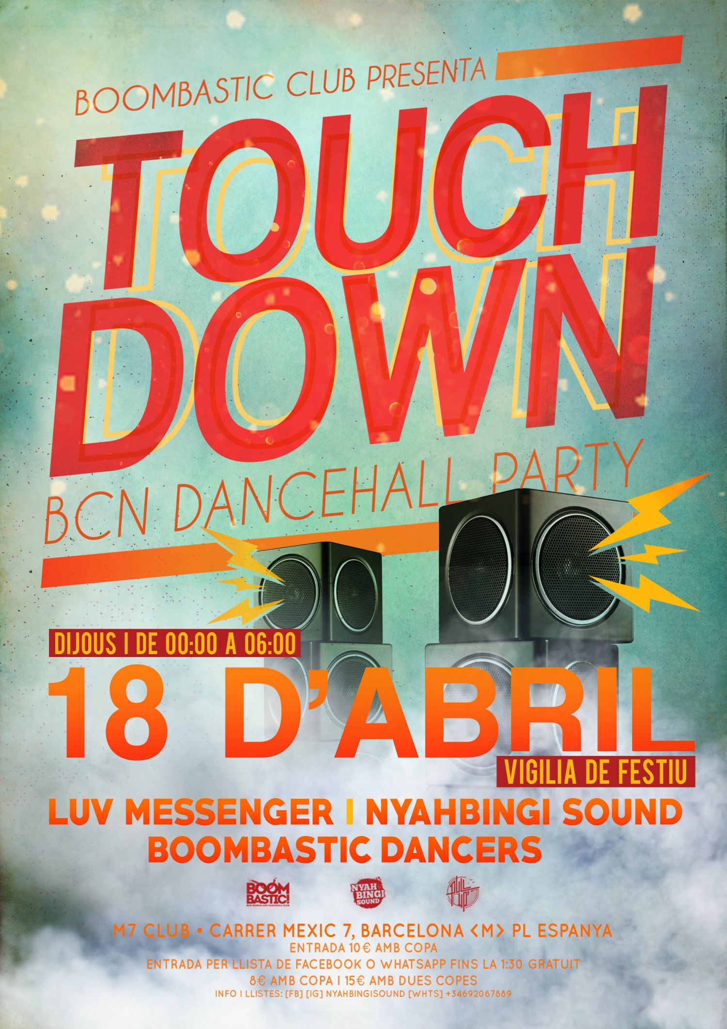 El proper dijous 18 d'abril (VIGILIA DE FESTIU) no et perdis la nova Touch Down Party! Vine a ballar a ritme del millor dancehall amb Luv Messenger Sound, Nyahbingi Sound i les BoomBastic Dancers fins les 6h de la matinada. Preus d'entrada al final de la info! Make the date and don't be late!