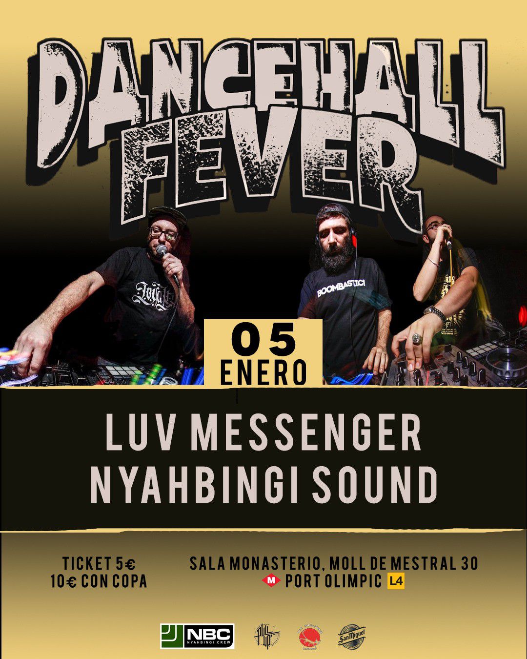 Aquest proper dissabte 5 de genero t'esperem a una nova Dancehall Fever a la Sala Monasterio de Barcelona! Luv Messenger Sound i Nyahbingi Sound als controls! T'esperem de 23h a 06h al Moll de Mestral 30, Port Olímpic.