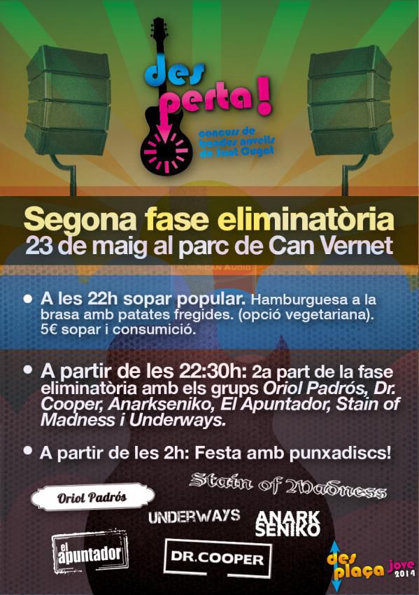 Des de les 22:30h. Segona fase eliminatòria amb els concerts d'Oriol Padrós, Dr. Cooper, El Apuntador, Anarkseniko, Stain of Madness i Underways.