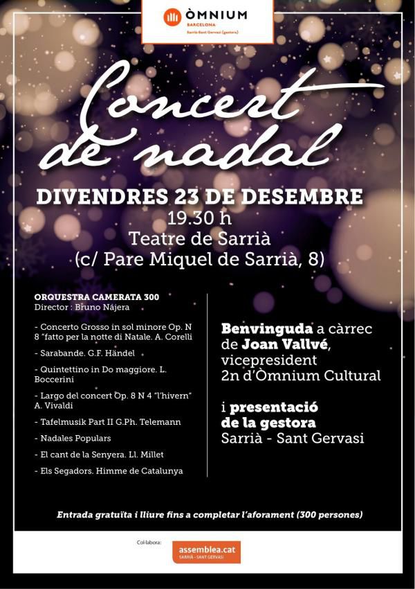 Concert de Nadal amb la Camerata 300 i dirigida per Bruno Nájera. Amb temes de Vivaldi, Boccerini i del cicle nadalenc tradicional. El Cant a la Senyera i Els Segadors.