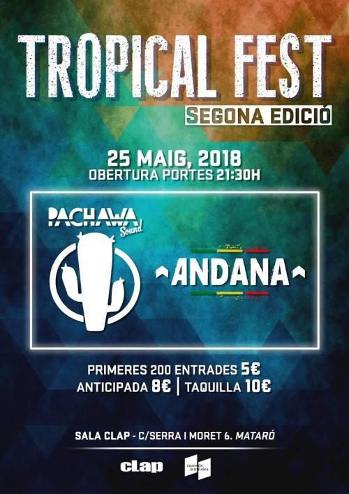 El Tropical Fest va néixer el 2017 al Clap amb l’objectiu de convertir-se en una cita anual que mostrés el talent i la potència de l’escena musical del Maresme. Després d’una exitosa primera edició amb Pachawa Sound, System Beat i Zoom Musiqueta, el pròxim 25 de maig torna amb un cartell que reuneix dues de les propostes més emergents de la zona.: Pachawa Sound i Andana.