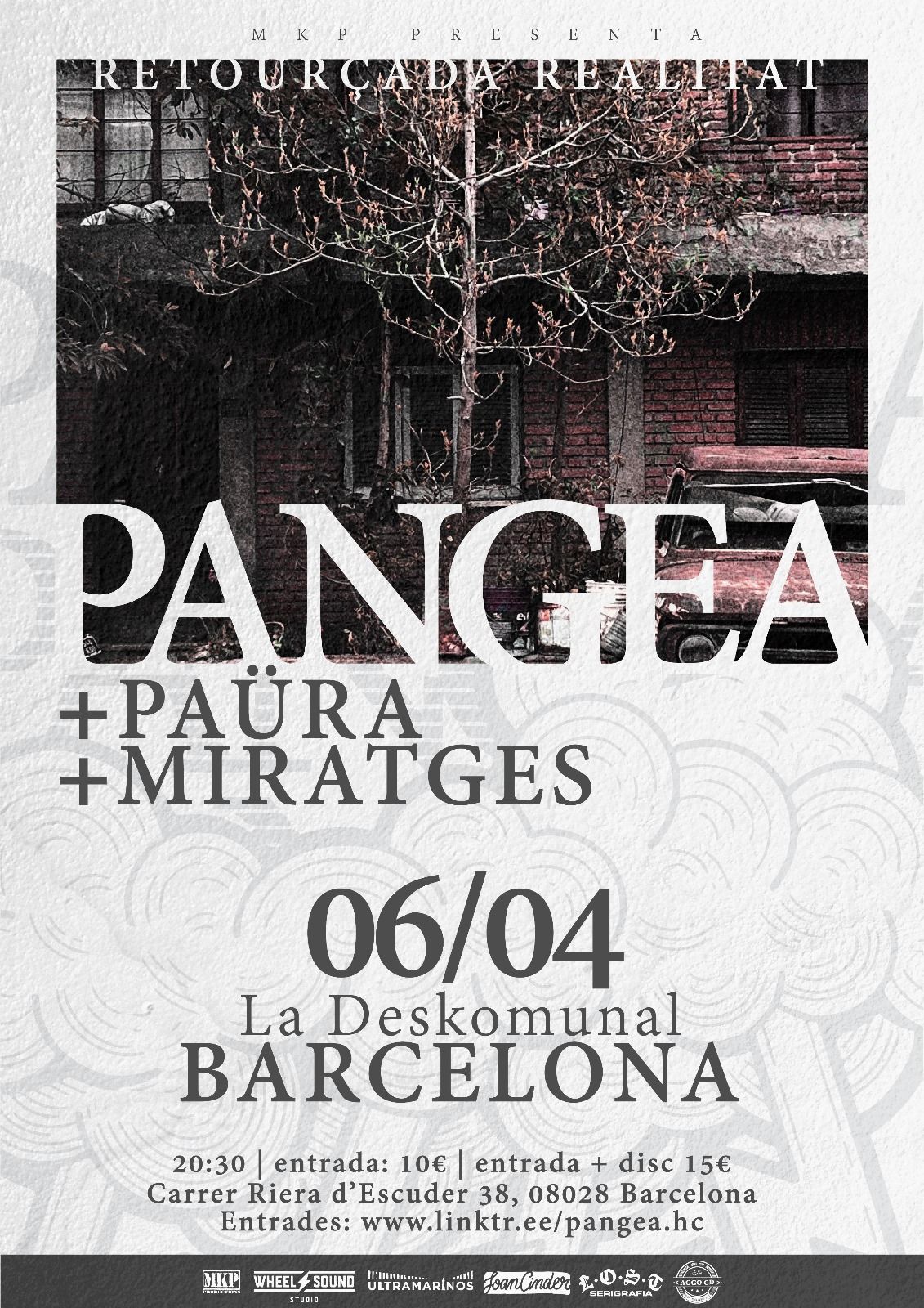 PANGEA, grup de punk-rock/hardcore melòdic de Barcelona arranca amb la gira presentació de "RETORÇADA REALITAT". Després de girar amb "Morir en l'Intent" tornen a la càrrega amb aquest segon treball, llençant-se a la carretera un cop més arreu tel territori nacional. L'estaran presentant a BARCELONA el 6 d'ABRIL a la Deskomunal. Per aquesta ocasió els acompanyaran PAÜRA, una banda ja veterana de l'escena barcelonina i del punk-rock en català, amb el seu darrer disc "El Costat Fosc". I obrint la vetllada tindrem a MIRATGES, un prometedor nou grup de rock alternatiu que aterra per fer soroll.