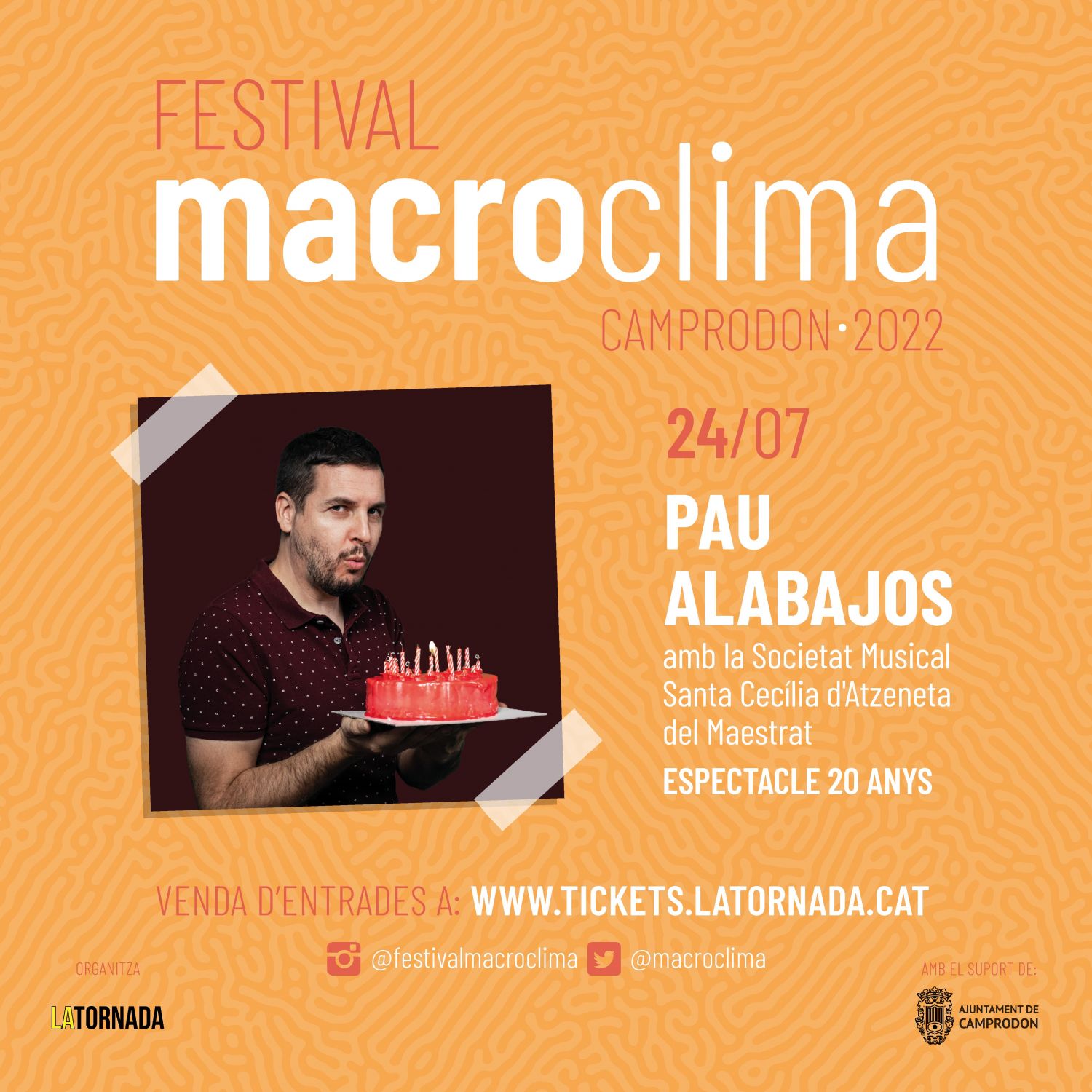 Una de les veus més reconegudes de la cançó d’autor als Països Catalans celebra ni més ni menys que 20 anys sobre els escenaris i ho farà amb un concert molt especial. Pau Alabajos s’ajuntarà amb la Societat Musical Santa Cecília d’Atzeneta del Maestrat per oferir un espectacle únic amb 50 músics sobre l’escenari. El cantautor de Torrent, juntament amb tota la banda, repassarà les cançons més reconegudes del seu repertori i les vestirà d’un nou univers musical amb més força que mai. El concert a Camprodon serà una de les úniques oportunitats per veure en directe l’espectacle més ambiciós de la seva carrera.