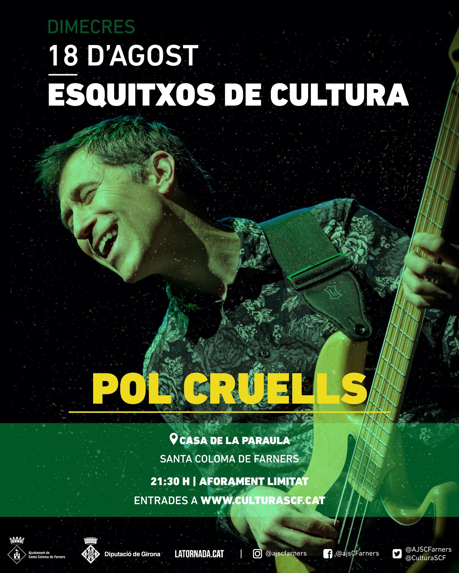 Tancarà la programació, el dimecres 18 d'agost, el sabadellenc Pol Cruells. Al músic l'hem vist habitualment acompanyant com a baixista a Els Amics de les Arts, però en paral·lel compta amb una àmplia trajectòria en solitari. A mig camí entre el folk, el pop i la cançó, el músic ens presentarà Fanzín, el seu quart treball.
