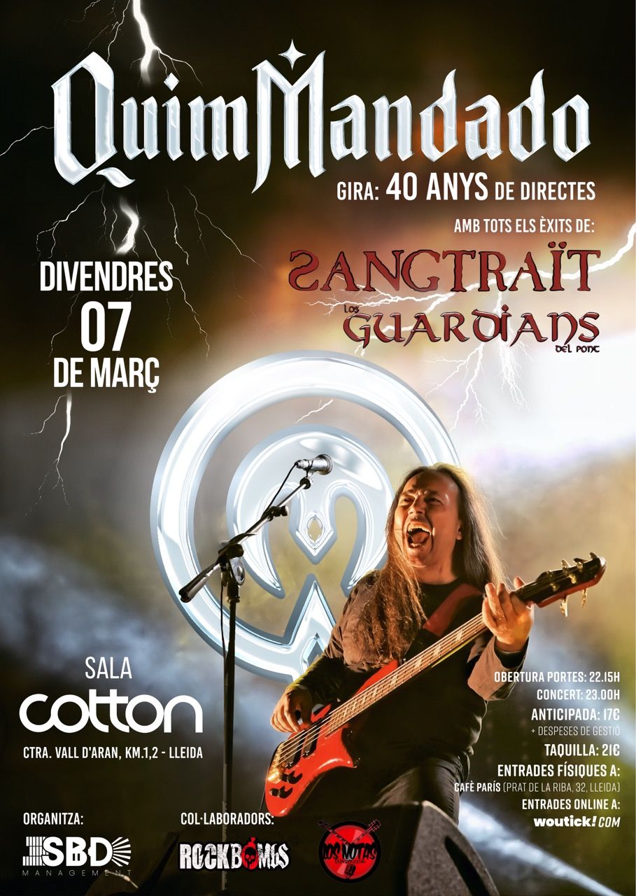 QUIM MANDADO en concert - gira 2025: 40 anys de directes, és l’espectacle musical més esperat del heavy metal en català que presenta la trajectòria del cantant, músic i compositor Quim Mandado, des dels inicis de SANGTRAÏT, passant per GUARDIANS-LGP i fins a l’actualitat al capdavant de la nova banda on l’acompanyen 2 dels seus fills (Guillem a la bateria i Ferran a la guitarra) i l’incombustible company de batalles Joan Cardoner a la guitarra.
