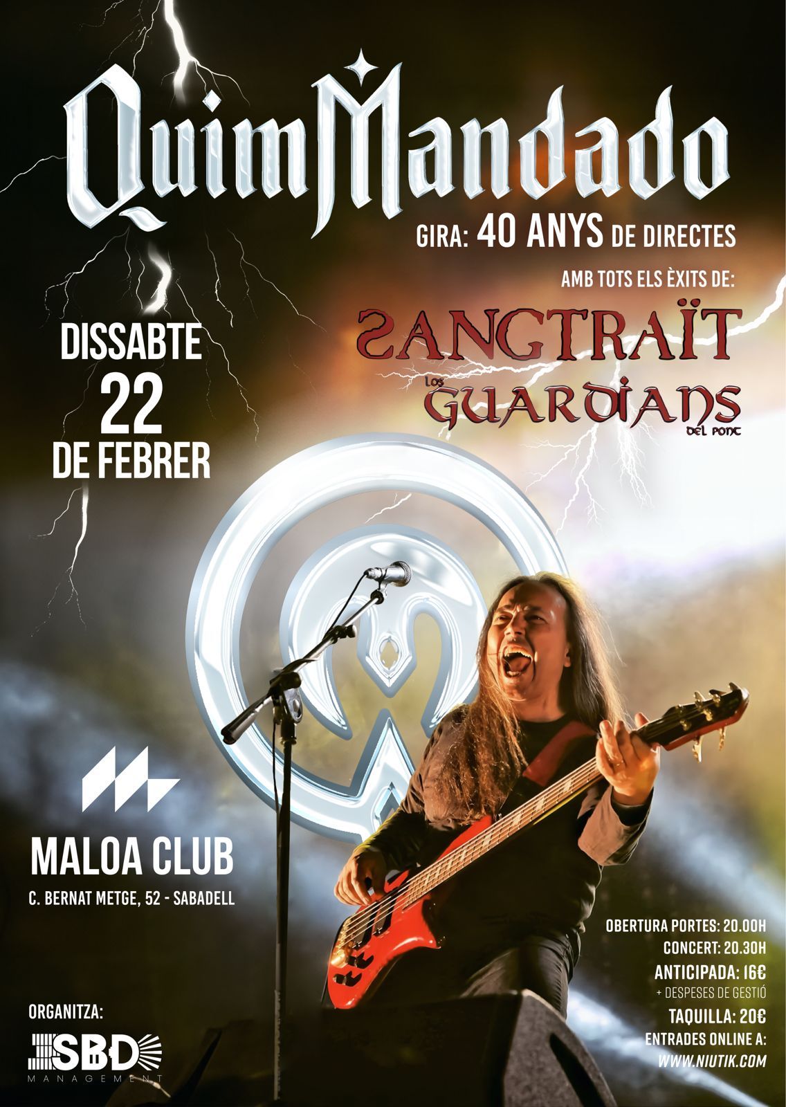 QUIM MANDADO en concert - gira 2025: 40 anys de directes, és l’espectacle musical més esperat del heavy metal en català que presenta la trajectòria del cantant, músic i compositor Quim Mandado, des dels inicis de SANGTRAÏT, passant per GUARDIANS-LGP i fins a l’actualitat al capdavant de la nova banda on l’acompanyen 2 dels seus fills (Guillem a la bateria i Ferran a la guitarra) i l’incombustible company de batalles Joan Cardoner a la guitarra.