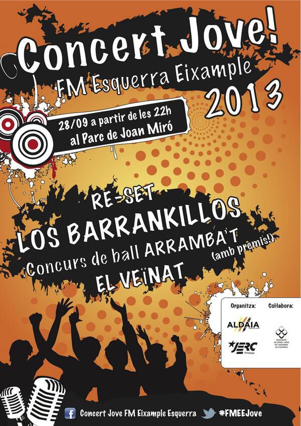 En el marc de la FM de l'Esquerra de l'Eixample us convidem a assitir al CONCERT JOVE el dissabte 28 de SETEMBRE a les 22H al Parc de Joan Miró amb: