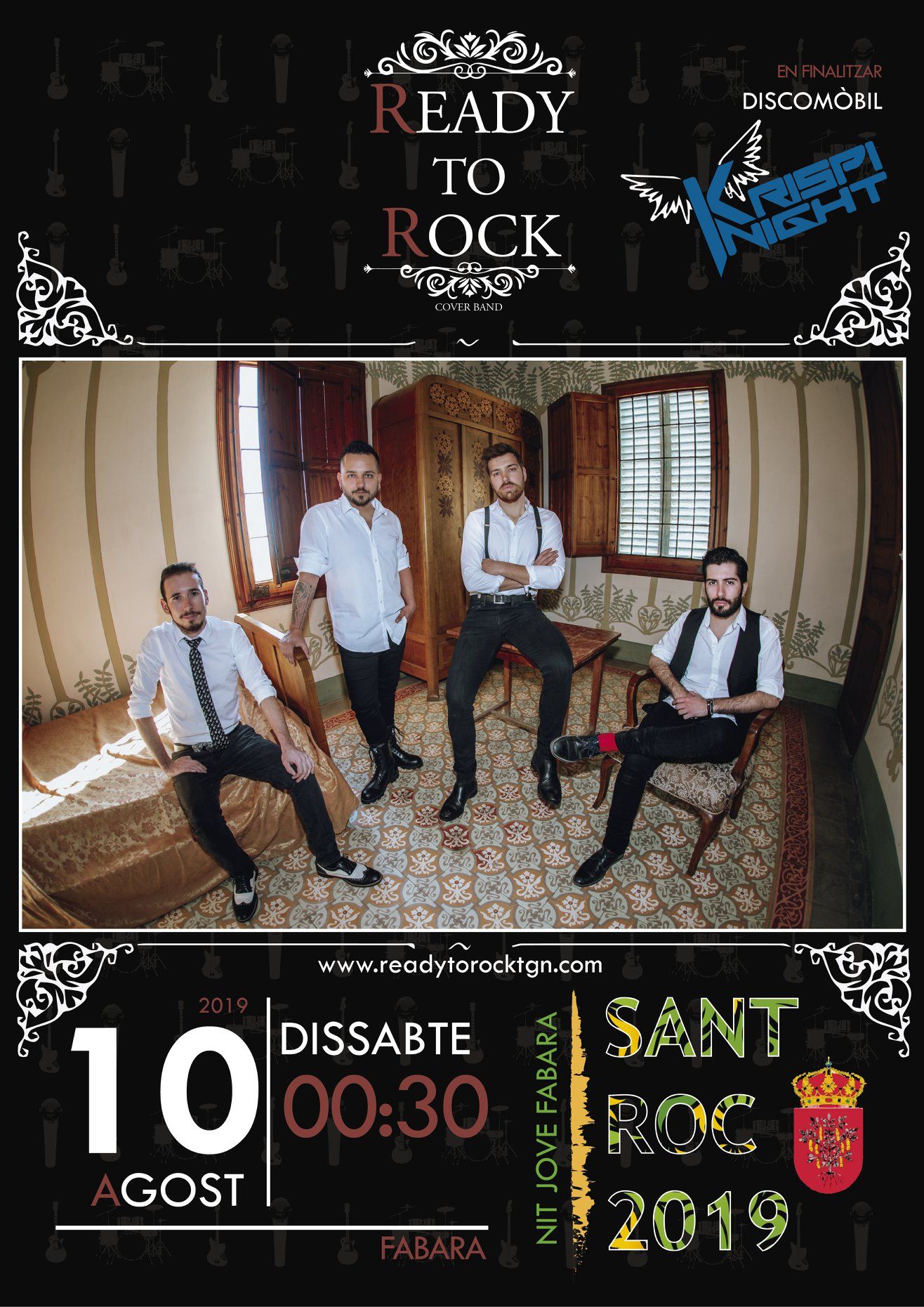 Festes de Sant Roc 2019 a Fabara. Tornen Ready to Rock al concert de pre-festes amb moltes ganes, disposats a posar la vila cap per amunt i fer-vos vibrar amb les versions de Rock d'ahir i avui. En finalitzar li passen el relleu a DJ Krispinight, que seguirà la festa amb Discomòbil fins altes hores del matí.