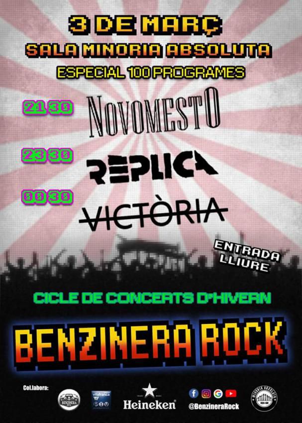 Concert amb Rèplica, Novomesto i Victòria per celebrar els 100 programes de ràdio del Benzinera Rock.