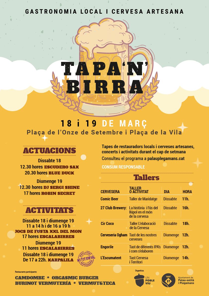 El cap de setmana del 18 I 19 DE març torna a Palau-solità i Plegamans Tapa’n’birra. La plaça de l’Onze de Setembre acollirà una fira amb cerveses artesanes de proximitat que es podran acompanyar de tapes de la gastronomia local. A més, durant tot el cap de setmana hi haurà diferents activitats com tasts guiats de cervesa, tallers i música en directe.